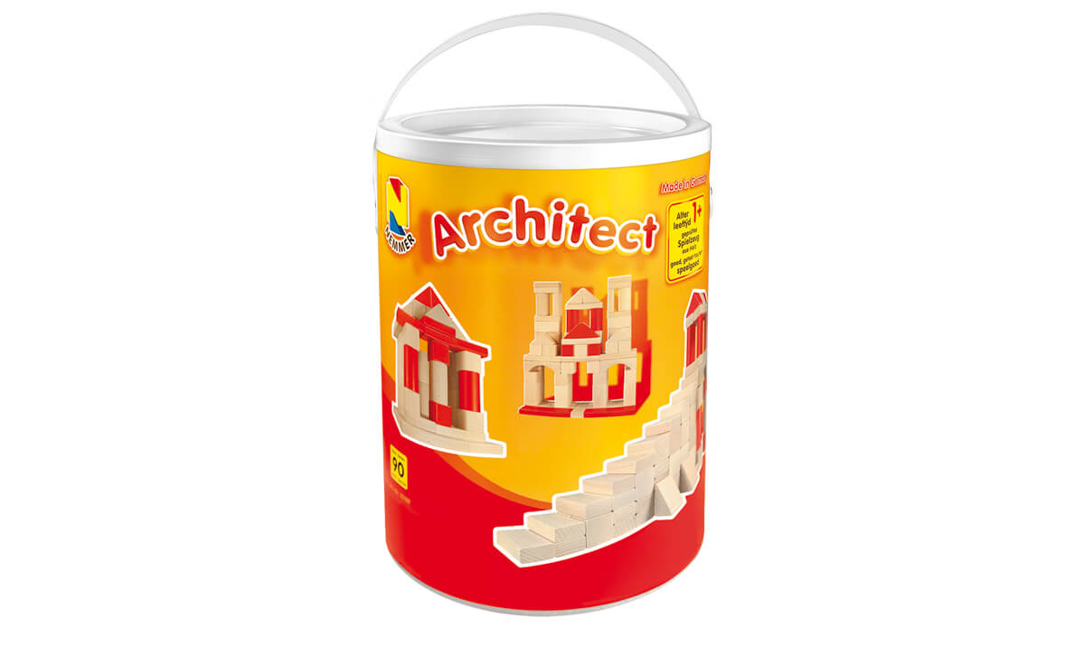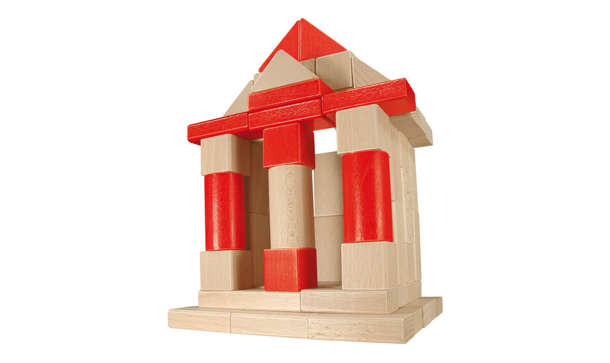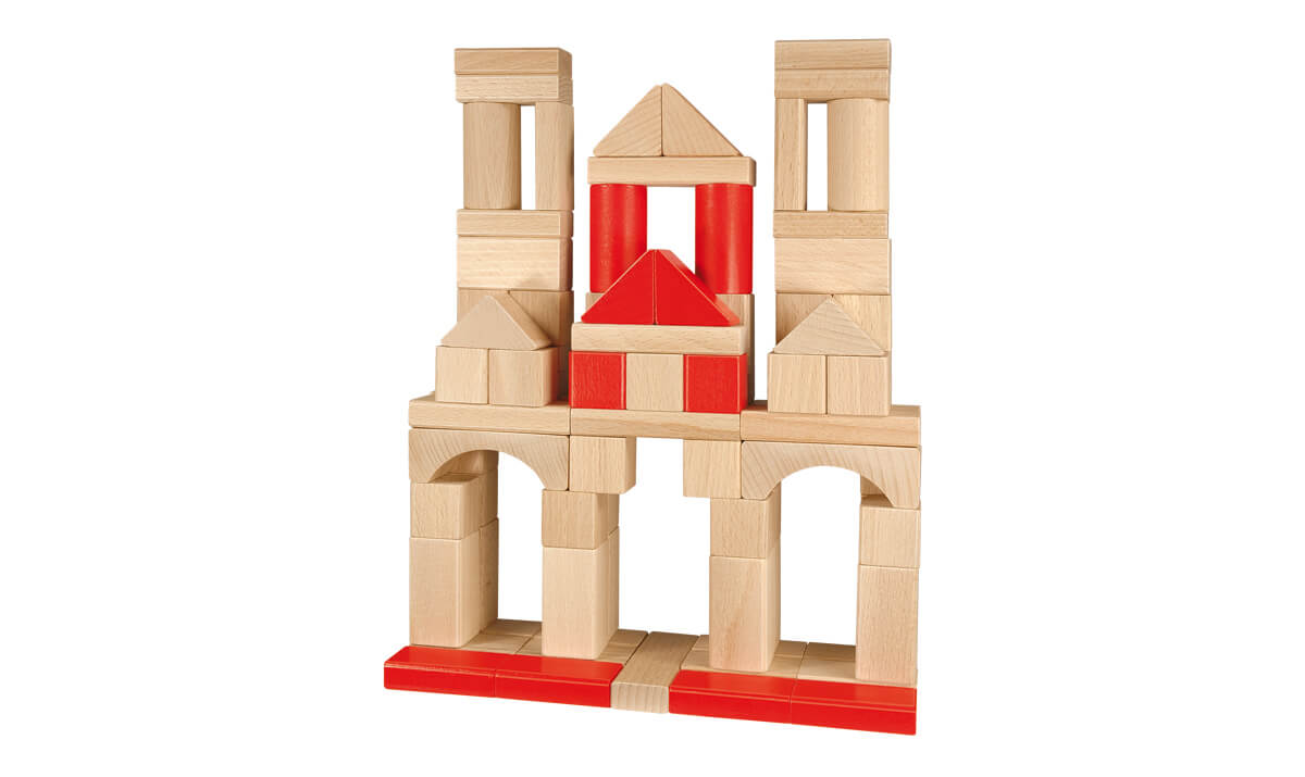 90 Holzbausteine in natur und rot, die in einer praktischen Bausteintrommel mit Griff verpackt sind. Mit diesen Holzbausteinen steht dem nächsten Bauvorhaben im Kinderzimmer nichts mehr im Weg. Die naturbelassenen Bausteine bilden das Grundgerüst, das durch rote Akzente perfekt ergänzt wird.