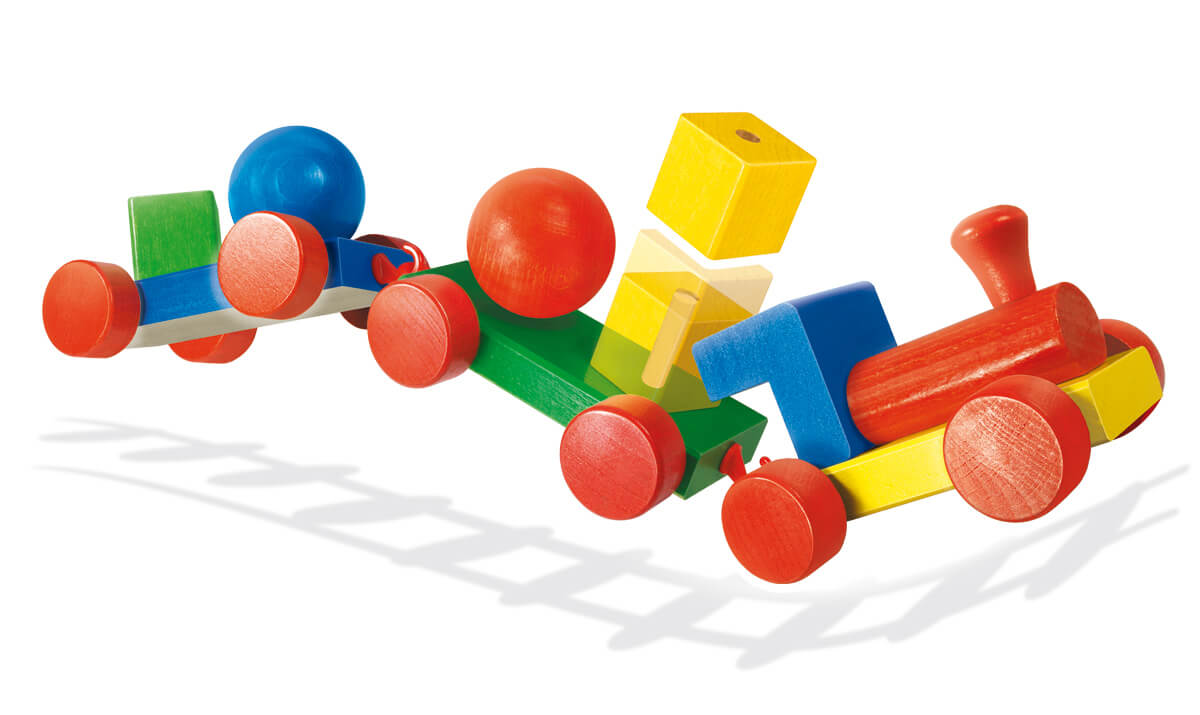 Ein Zug, der dank der gut beweglichen Räder nicht nur Fahrspaß auf allen Böden garantiert, sondern auch mit den Kugeln und Klötzen jederzeit neu beladen und gestaltet werden kann.
